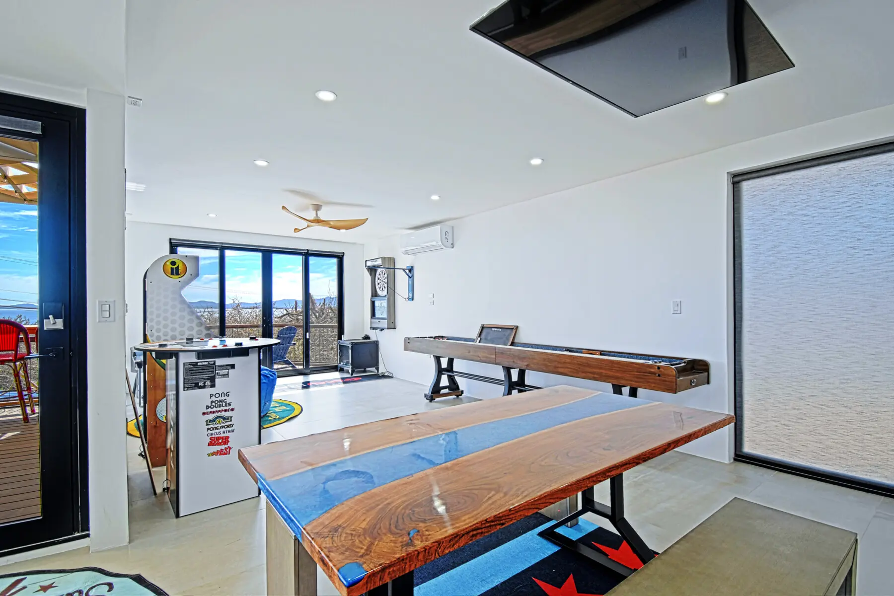 A large 8-person hot tub, infinity gaming tables, and retro arcade games.